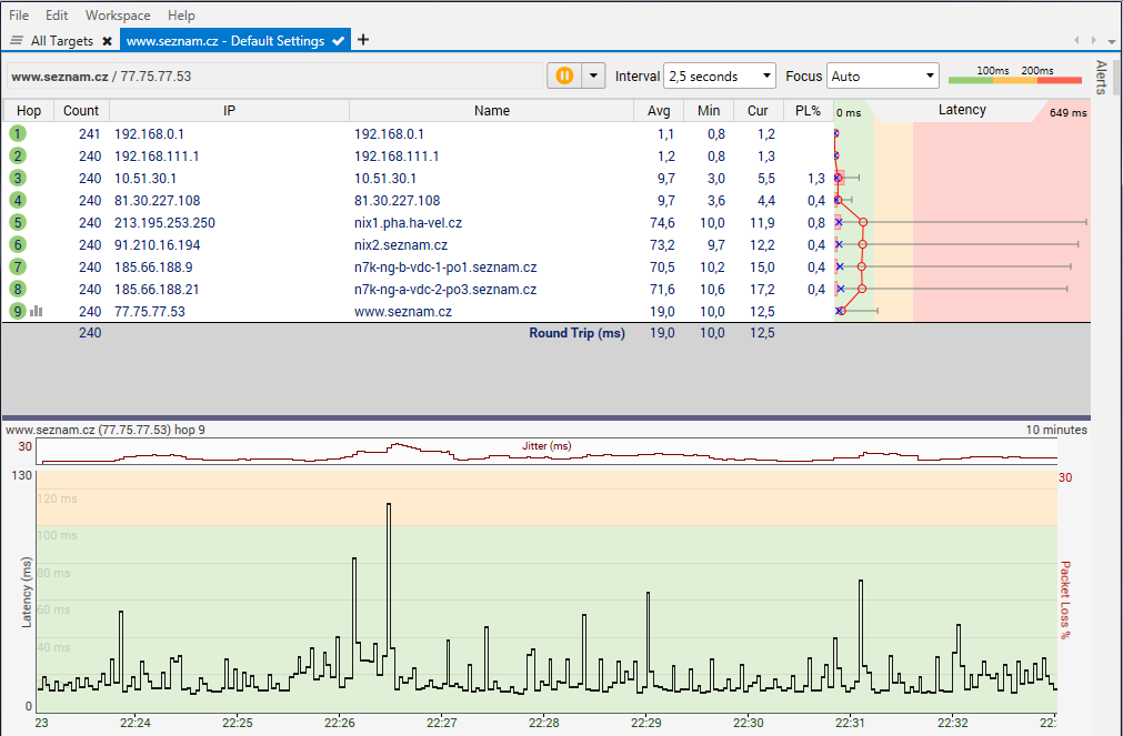 Stáhni https://www.pingplotter.com/freeware.html, nainstaluj a spusť. Do pole Target Name napiš http://www.seznam.cz, Trace Interval zvol 2,5 second a klikni na zelené tlačítko "play".