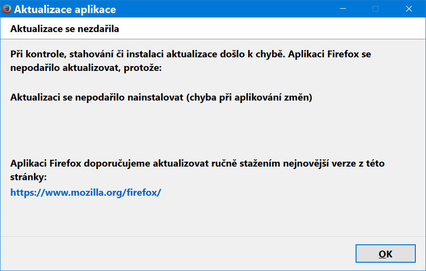Dnes mi Firefox nabídnul aktualizaci na novou verzi. Tu jsem spustil, ale po nějaké době se zobrazila informace, že došlo k nějaké chybě a aktualizaci se nepodařilo nainstalovat a doporučilo mi to aktualizovat ručně stažením nejnovější verze.