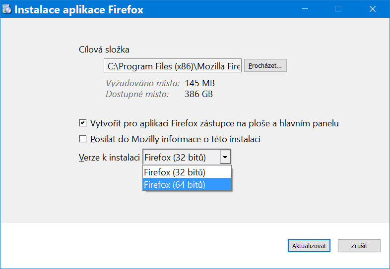 Aktualizace/instalace Firefoxu a 32/64 bitů