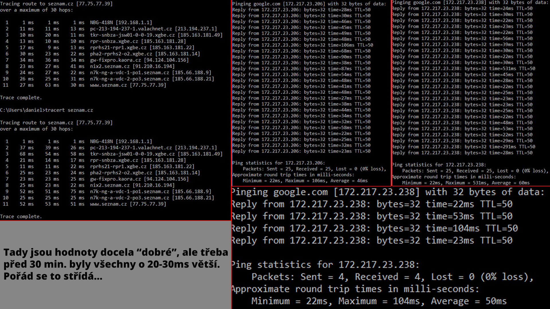 Při pingování na seznam.cz ping taky kolísá (velmi podobné hodnoty jako ve hře), to samé i na google atd. Vždy bylo ztraceno 0 packetů. Pří tracertu asi nejsou hodnoty v pořádku (?). Přikládám pár screenů z pingování a použití "tracert".