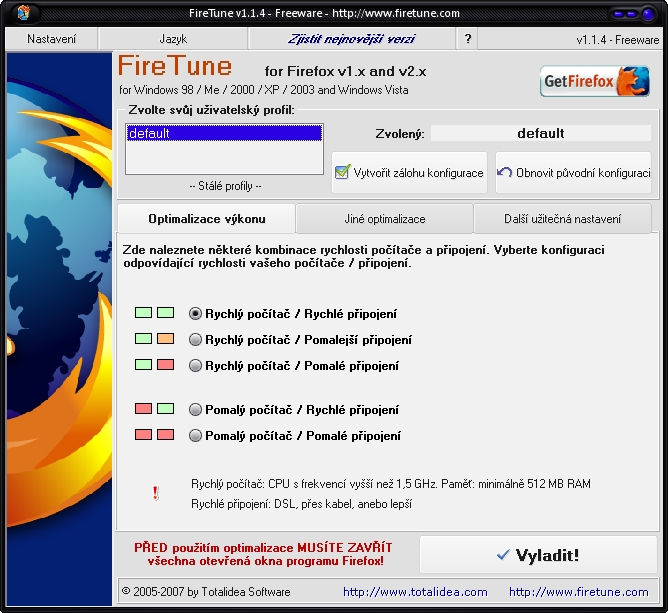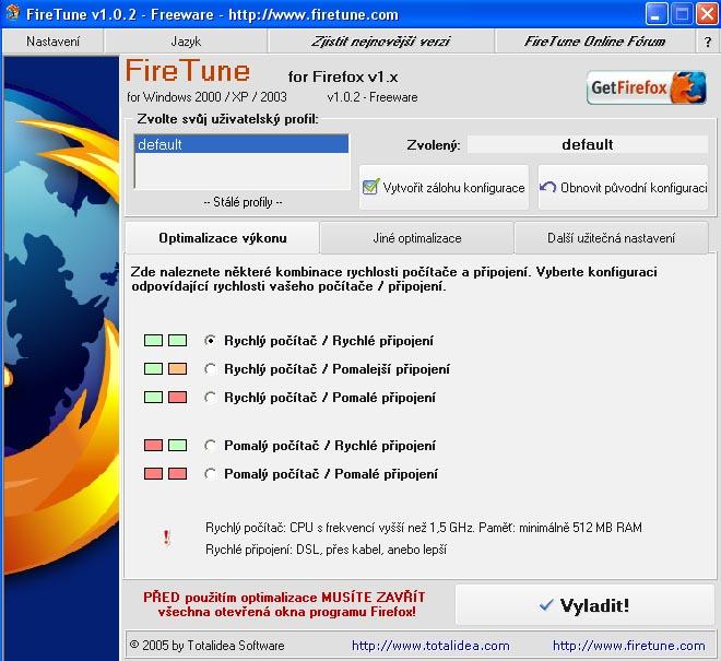 firetune fungoval kdysi dávno - teď už už je to na nic protože v průběhu verzí to zakomponovali vývojáři přímo do FF.Dneska se celkem dá rozšíření fasterfox - ale není to nic extra