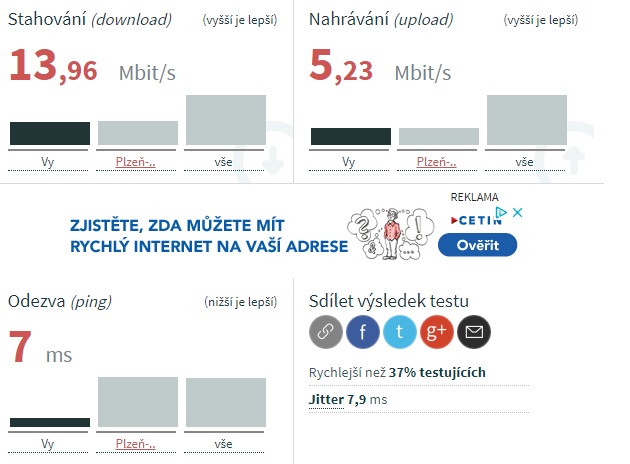 Připojení by mělo být 15 Mbit/s. Naměřeno mám mnohem méně. (PS: na fotce je zatím nejmenší ping za dnešek )