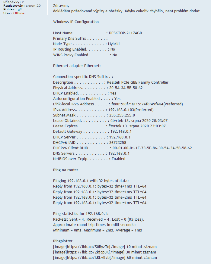 chtěl bych Vás požádat o radu ohledně internetového připojení. Ping mi každých +- 10 sekund vyskočí na čísla 1000-1500 ms a poté se zase ustálí. Stolní PC mám připojeno kabelem a Nootebook jede přes wifi, ale na každém zařízení se vyskytuje stejná chyba. Zkusil jsem už různě sledovat, jestli mi nějaký program nezatěžuje internetové připojení, ale malokterý program (až na výjimky) mám nainstalovaný na obou zařízeních.