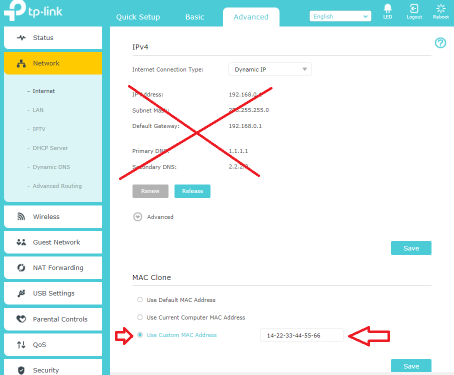 Jdi do položky WAN toho asusu a opis si všechny údaje včetně MAC adresy. A úplně stejně vyplň položku WAN v tom tplinku.