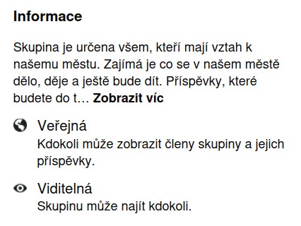 Veřejná skupina: Vidí ji všichni na Facebooku i mimo něj. Kdokoli se také může podívat na věci, jako jsou popis, fotky, diskuze a videa události.
