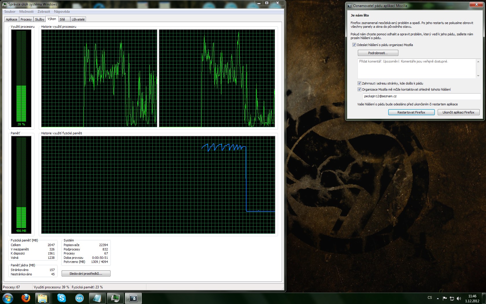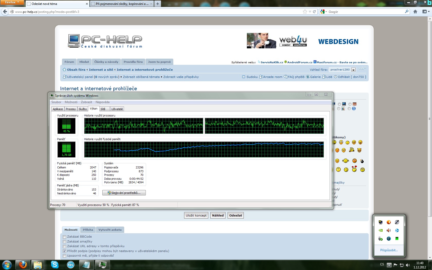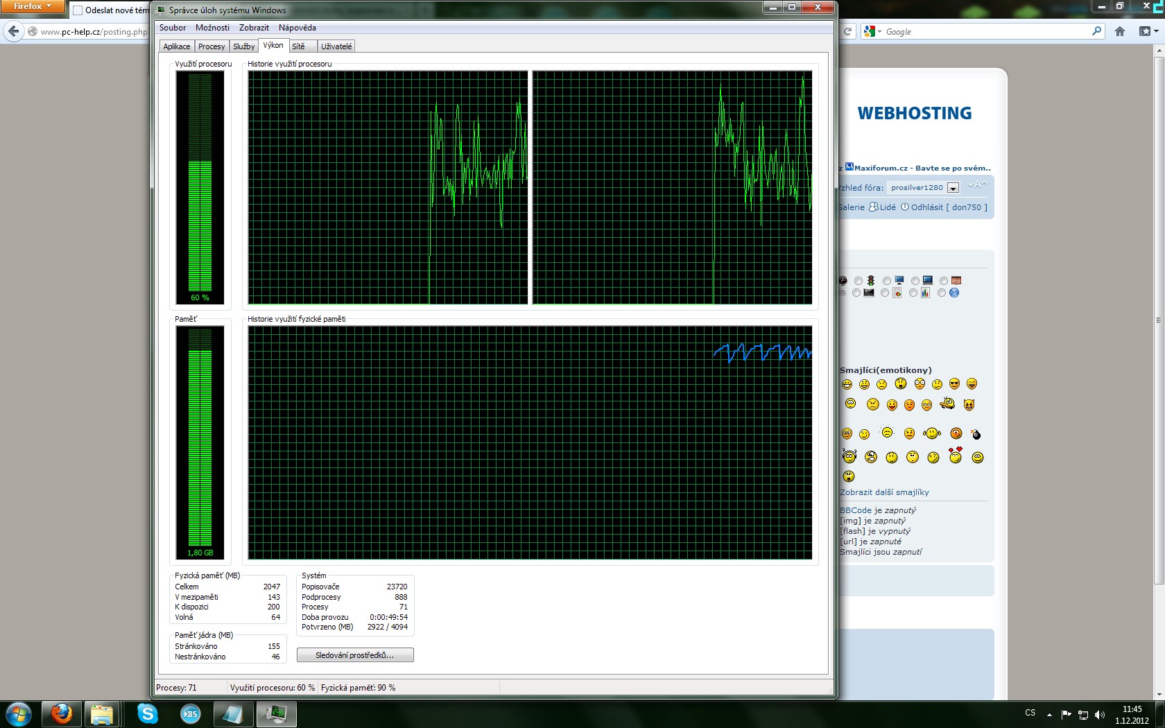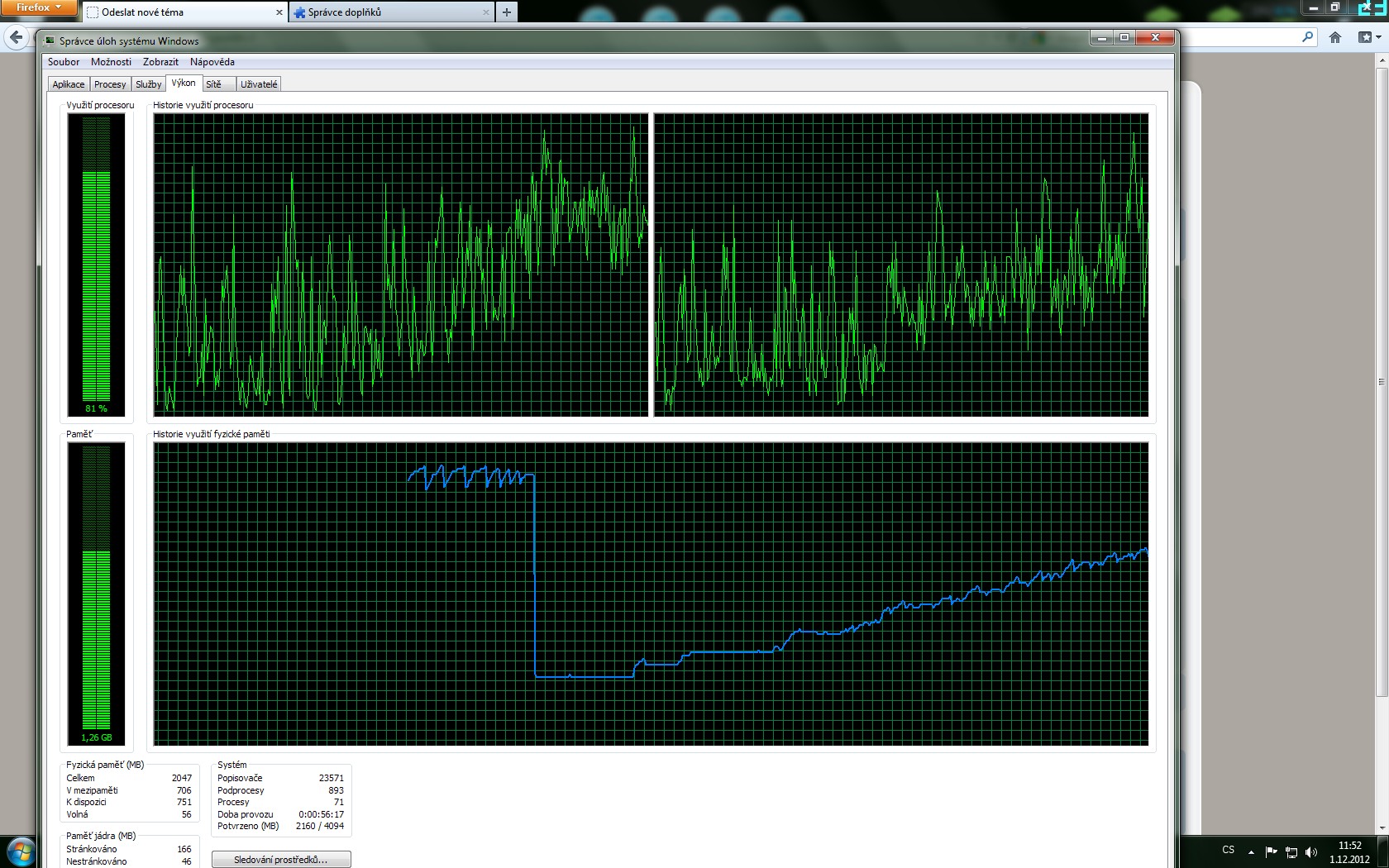 Dobrý den, v poslední době se mi děje to, že mi jak Google Chrome, tak Firefox neskutečně vytěžují RAM i když mám otevřeny třeba jen 4 záložky - záložku s vyhledáváním na googlu, e-mail na seznamu, a třeba 2 záložky PC-Help. A ono stačí mít i třeba jen jednu záložku otevřenou a stejně se RAM po nějaké době dostanou na maximum. Mám sice jen 2 GB DDR2 800MHz a dvoujádro 2,5 GHz, ale nikdy předtím jsem takovéto problémy neměl. Doplnky mám v prohlížeči pořád stejné a programy na pozadí sice nějaké běží, ale zase tolik toho nespotřebují. Chrome dělá úplně to samé, jen tak čsto nepadá (Firefox padá každou chvíli). Nevzpomínám si, od jaké doby se toto děje, takže nemohu říci například, že se toto způsobilo instalací nějakého programu. Přikládám screeny, které jsem nafotil během psaní tohoto příspěvku.