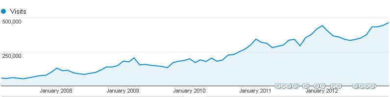 2013 = DNES ....a jsme v roce 2013. Pojďme se ještě podívat, jak se fóru za celou tu dobu vedlo co se týče návštěvnosti - resp. pouze za období r2007 - dnes (dříve jsme GoogleAnalytics účet neměli). Jak je vidět, jdeme stále "do kopce" a jsme za to moc rádi