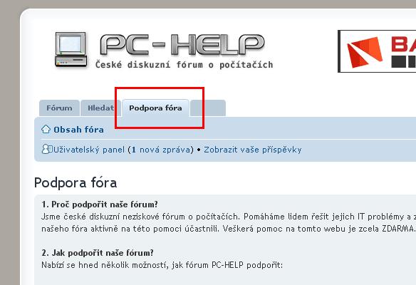 Rád bych vás informoval o tom, že byla zprovozněna staro-nová sekce Podpora fóra (viz. obrázek níže). Sekce se stala po přechodu na phpbb 3.0 dočasně nedostupnou, nyní je vše uvedeno do původního stavu. Kromě jiného zde ve spodní části naleznete soupis uživatelů, kteří našemu fóru nějakou formou v minulosti pomohli..