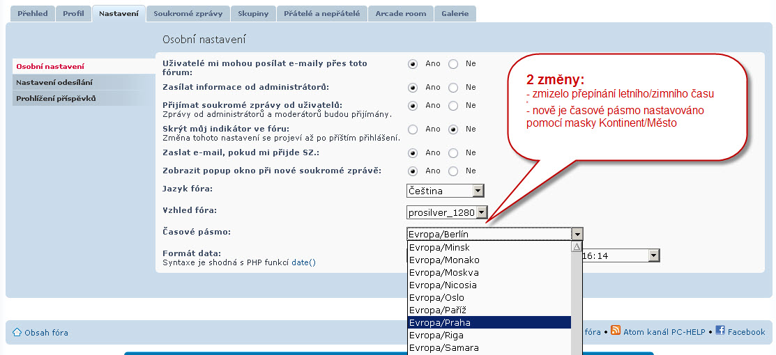 - v uživatelském panelu zmizela volba letní/zimní čas (děje se už automaticky!)