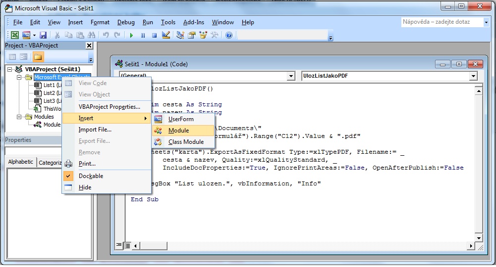 End SubVložení modulu přes Alt+F11 a pomocí pravého tlačítka (viz.obr)