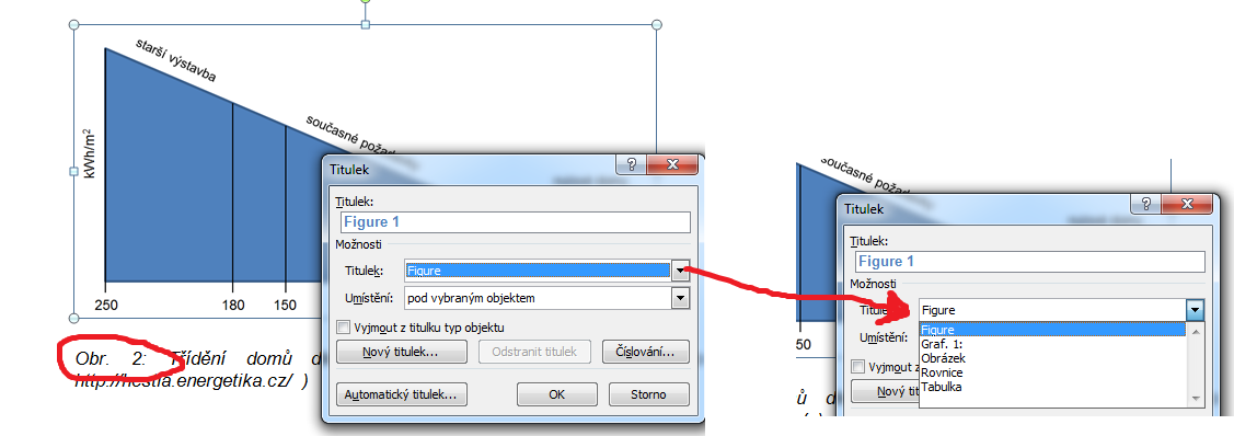 Nicméně kliknu na vložit titulek a už mi to nenabízí můj předdefinovaný tvar ? Jak je to možné ? Tudíž to ani nechce počítat a dělat seznam obrázků.