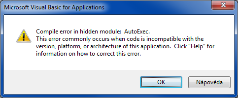 Napadá někoho, jak se téhle pitomosti zbavit? Zkoušel jsem Gůůglovat úvodní frázi „Compile error in hidden module: AutoExec.“, ale i přesto, že jsem si vyžádal stránky v češtině, jsou všechny výsledky anglicky a to fakt nedám.
