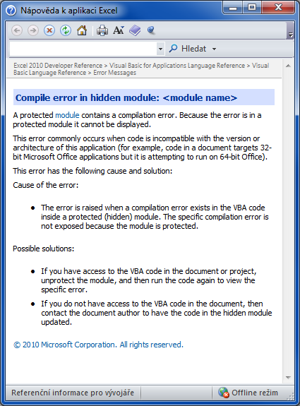 Chyba je aktivována, když existuje chyba kompilace v kódu VBA uvnitř chráněného (skryté) modulu. Chybový kompilace není vystaven, protože modul je chráněn.