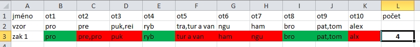 Zeleně jsou označeny shodné odpovědi, červeně ty špatné. Číslo 4 na konci řádku chci vypočítat - je to počet "zelených" políček.