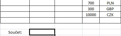 dokázal by mi někdo poradit, jak utvořit vzorce v tabulce, kde by se vždy vynásobila částka s měnou uvedenou ve vedlejší buňce a následně by se všechny tyto řádky sečetly do jedné buňky jako Souhrn v CZK?