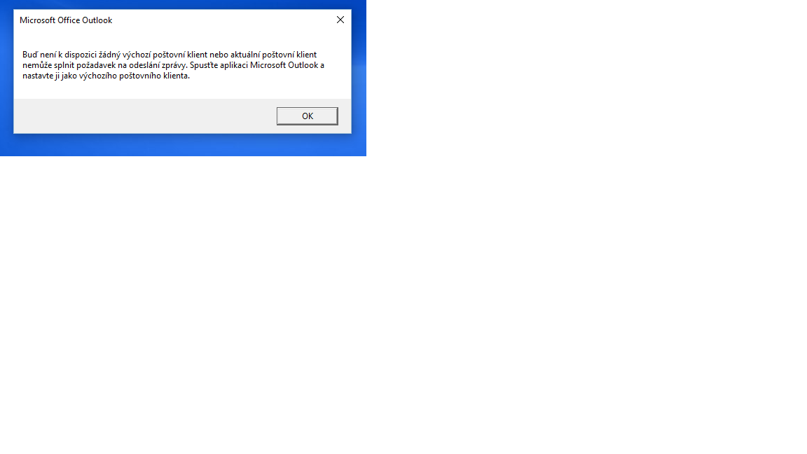Mám nainstalovaný Office 2016 a Outllok stále zobrazuje hlášku, že není k dispozici žádný výchozí poštovní klient, nebo že aktuální poštovní klient nemůže splnit požadavek na odeslání zprávy viz. příloha.