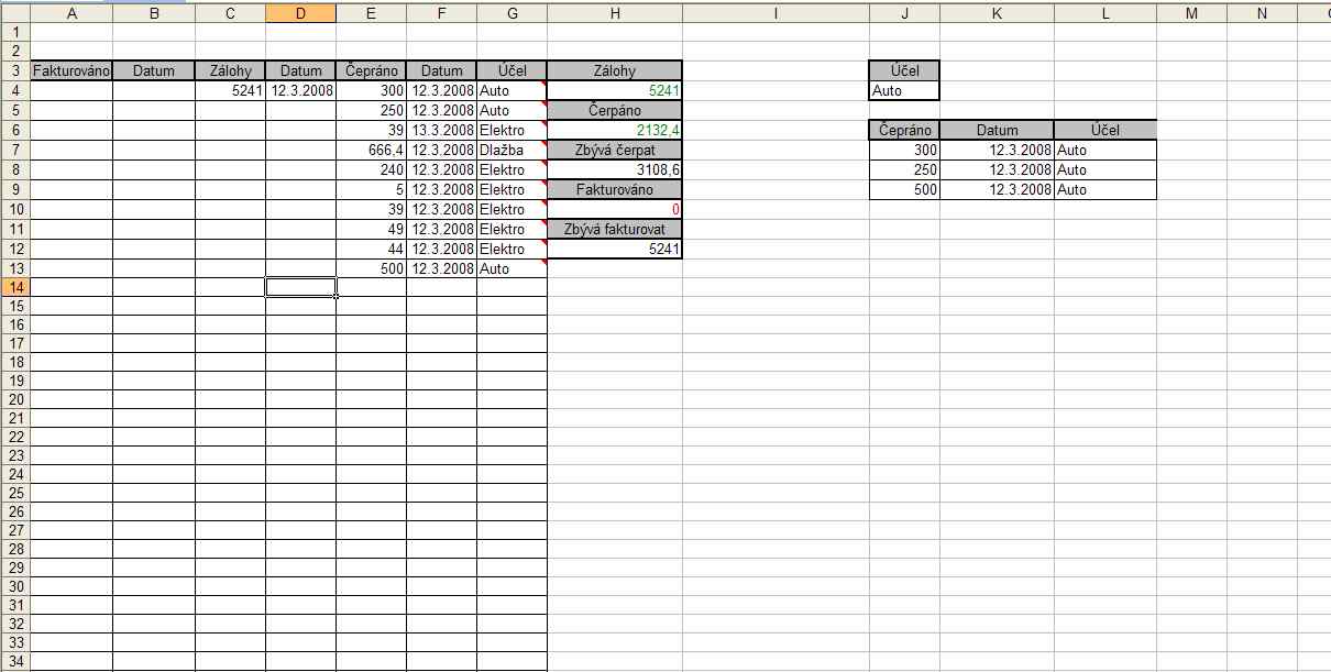Tak otohle mě jde.Abych do políčka Účel J3 mohl napsat slovo a ten konkrétní výběr buněk se zobrazil dole.Je mě jasný že to asi nebude asi jen tak a tak by mě stačilo když by se zobrazovaný výběr aktualizoval pokaždé když do tabulky (levé) přibude zápis , který bude mít jako účel "Auto" snad se to dá pochopit.