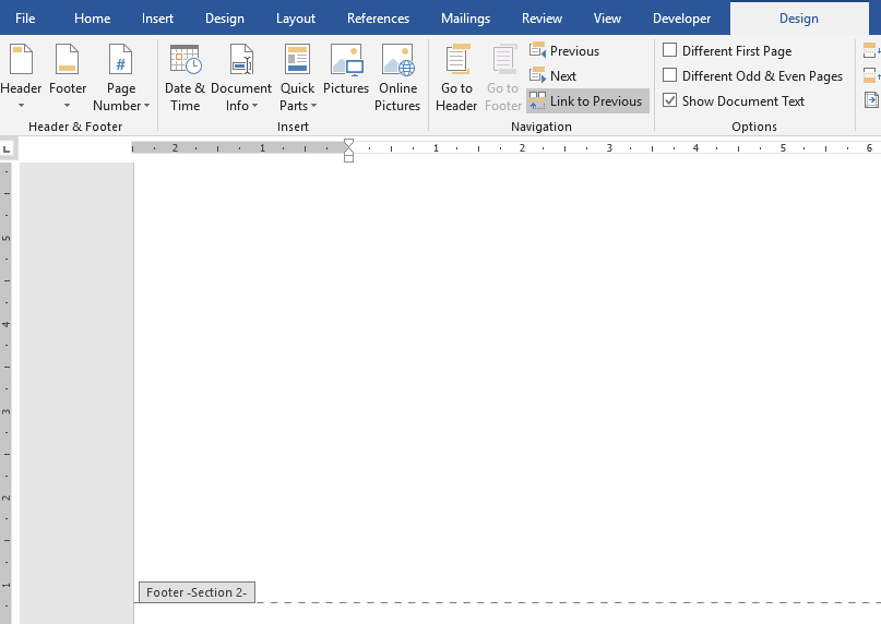 Sekcie sú defaultne prepojené, teda dedia kompletný vzhľad strany tj. aj definciíciu hlavičky a päty. Na ich oddelenie stačí zrušiť ich spojenie s predchádzajúcou v paneli vzhľadu pätičky a potom prepracovať vzhľad na požadovaný text - pripnutý opakovane v päte stránok jednej sekcie.