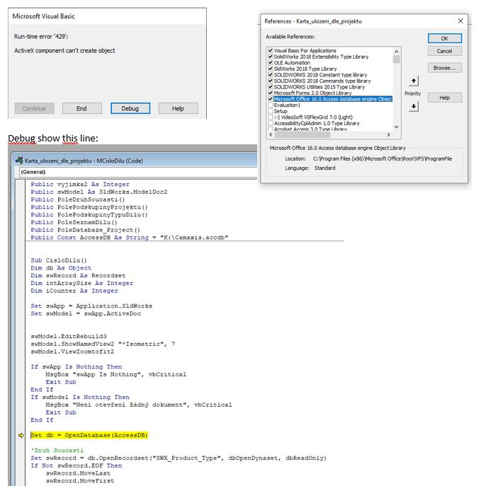 Databáze je na stejné cestě, verze SolidWorks 2018 SP 5.0, Windows 10 (64bit) i office 365 (32bit) je stejná na obou PC.