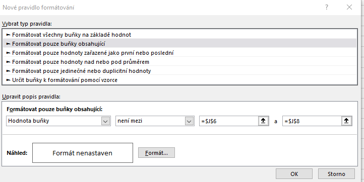 Zdravím, potřeboval bych poradit s podmíněným formátováním. V příloze mám xls soubor. Do žlutých políček napíšu spodní a horní toleranci (1 - spodní a 2 - horní), následně budu zapisovat data do modrého pole a pokud bude nějaká hodnota mimo tolerance, pole s touto hodnotou mi zčervená.