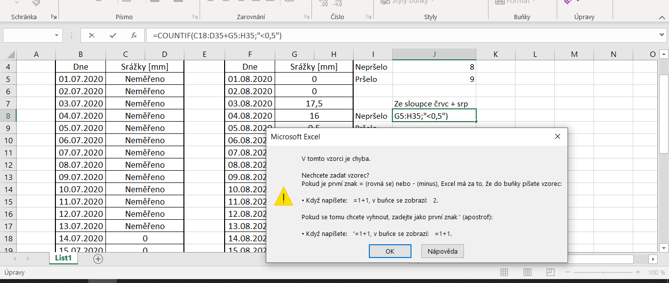 Takže když bude hodnota v tabulce 0, tak to započítat do dnů, kdy nepršelo a když bude v tabulce 0.5 a více, tak započítat do dnů, kdy pršelo a na konci měsíce bude vidět poměr pršelo/nepršelo.