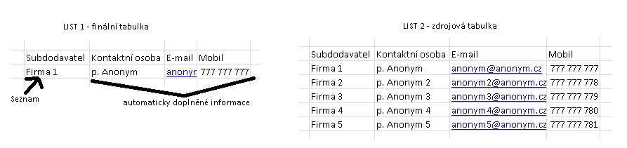 Vytvářím tabulku, kde je určitý seznam dodavatelů a jejich kontaktních informací. Vytvořil jsem si rozevírací seznam (přes Data>Ověření dat> Kritéria seznam, a do zdroje jsem dal první sloupec, se jmény jednotlivých subdodavatelů). Ale chtěl bych, aby když si vyberu nějaké jméno, tak se mi samo do zbývajících sloupců doplní i ostatní info. (přikládám jednoduché schéma)