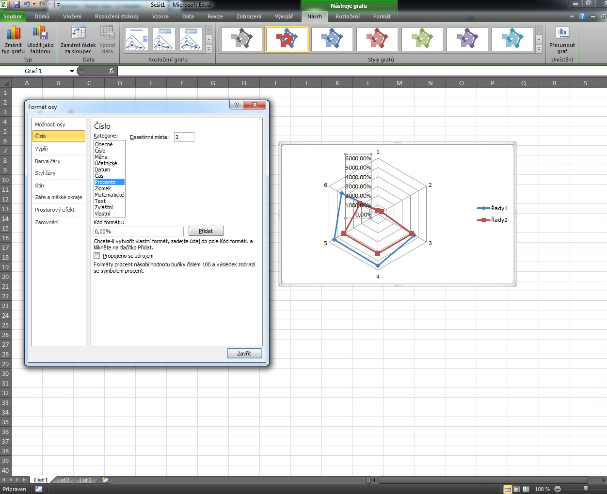 Ahoj, potřebovala bych poradit - mám vytvořený paprskový graf a na hlavní ose se mně neukazují procenta, mám tam jenom 100, 200, 300, ale já potřebuji 100%, 200% a 300% a nemůžu na to přijít. Graf i zdrojová data posílám jako obrázek v příloze. Moc prosím o radu. Andrea
