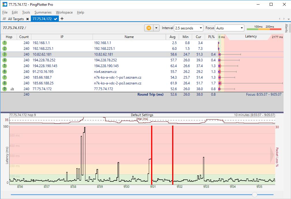 Taktéž tu, jak jde vidět na screenshotu z pingplotteru, co chvíli skáče odezva a packet loss do žlutých až červených hodnot,