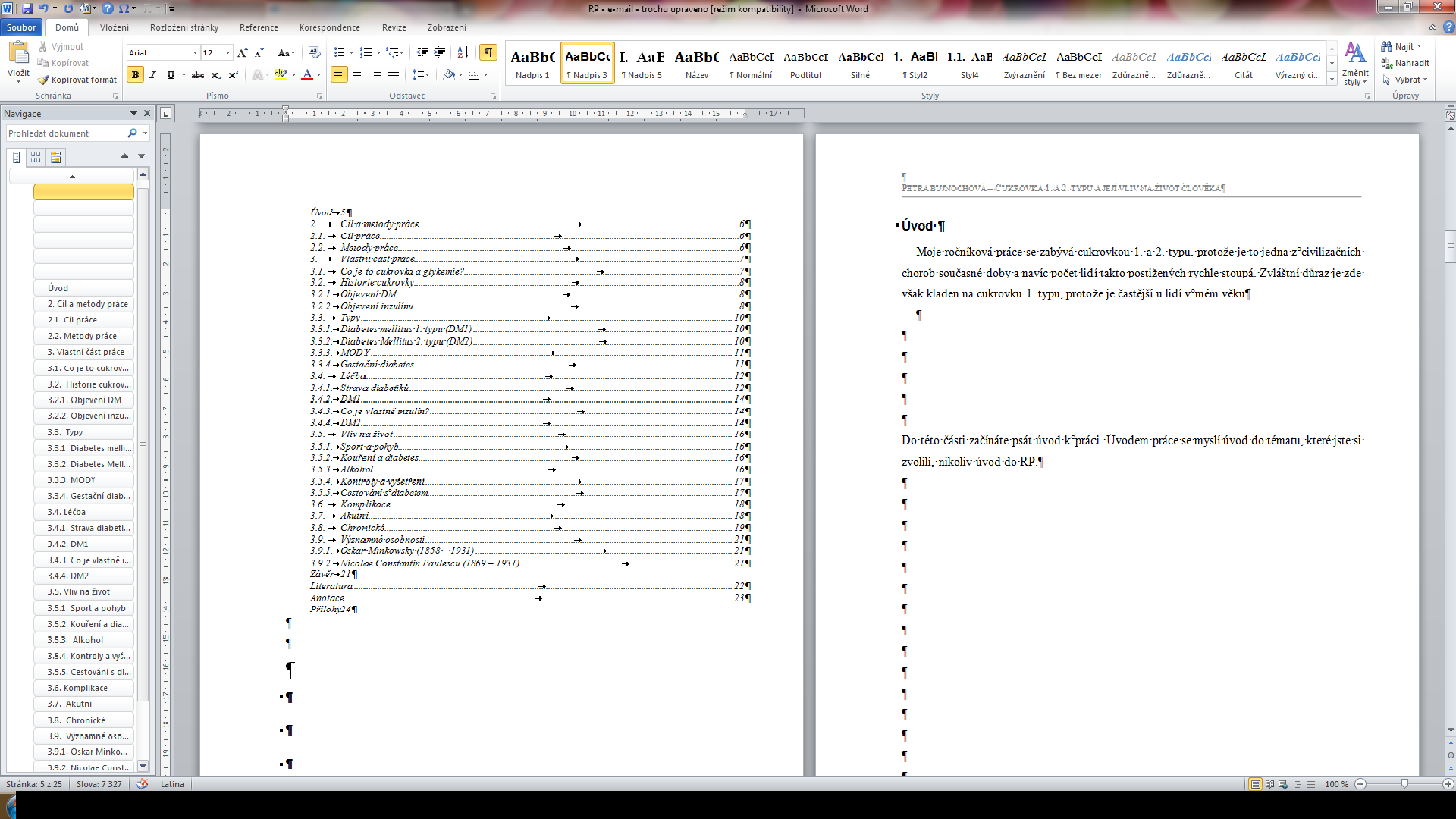 Ahoj, mohl by mi prosím někdo z Vás poradit, co jsem udělala špatně? Píšu ročníkovku, jejíž součástí je obsah. Mám tam asi 35 řádků, ale 1. a 3. od konce mám nějak blbě zformátované. Problém je v tom, že číslo stránky se mi píše hned vedle nadpisu, místo do pravé části stránky stejně, jako všechny ostatní.