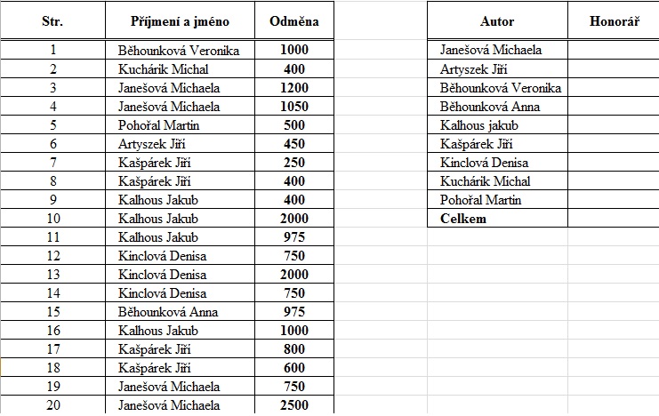 potřebuji, aby se pro každé jméno spočítal celkový honorář.