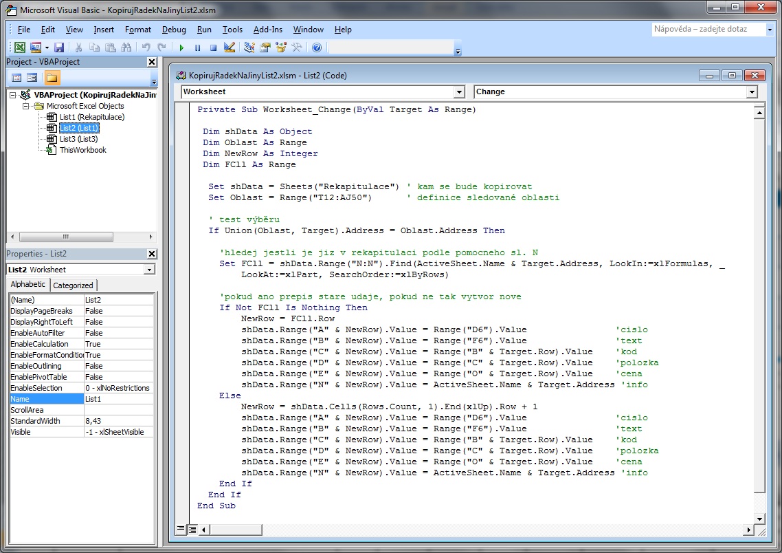 mám x listu a v kazdem listu je tabulka s fakturaci. Prvni list je nazvany rekapitulace a do tohoto listu bych automaticky potreboval dostavat data z listu ostatnich a to ve chvili kdy do nich neco napisi.