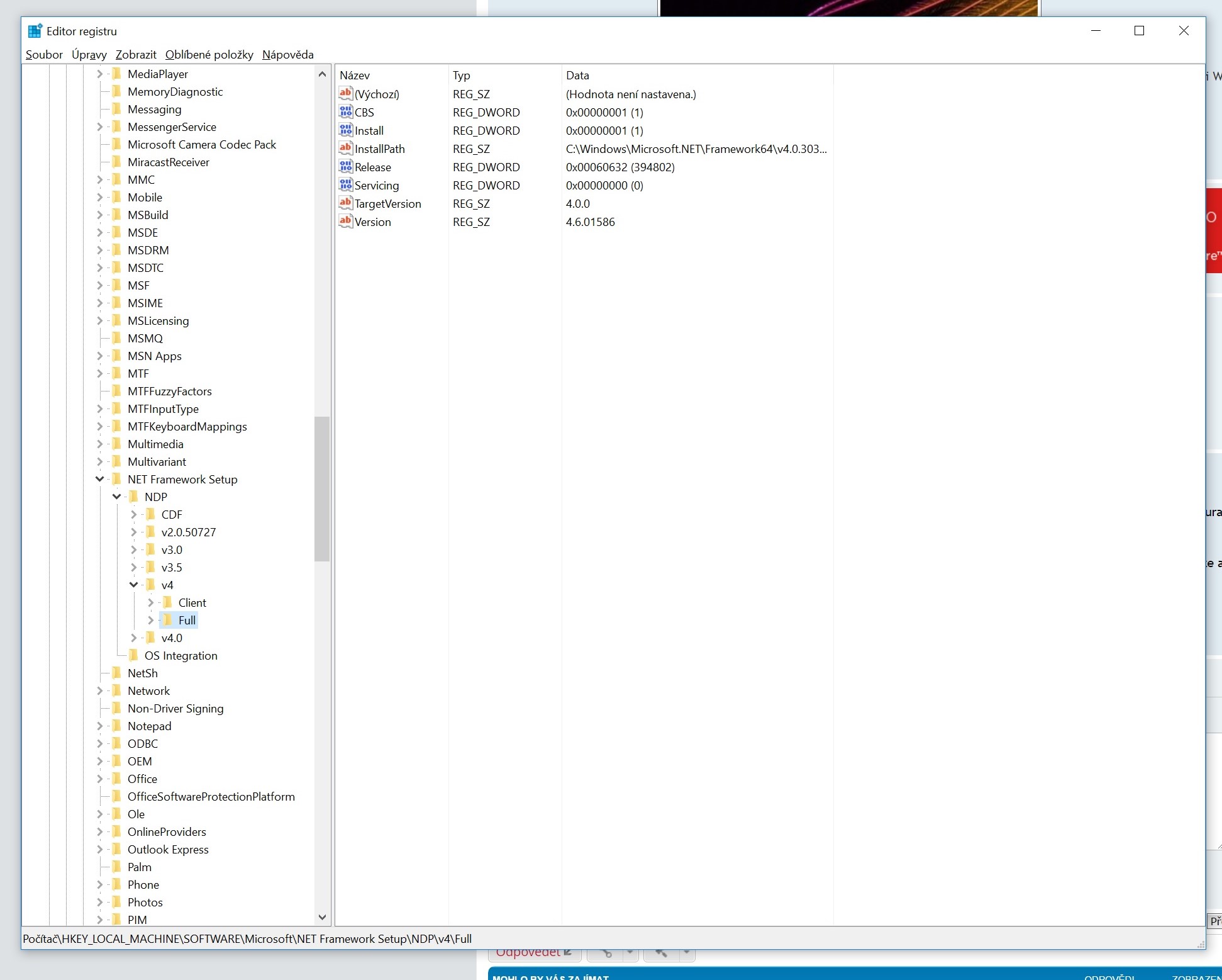 V registru to vidím, měla by tam být verze .NET Framework 4.6.2
