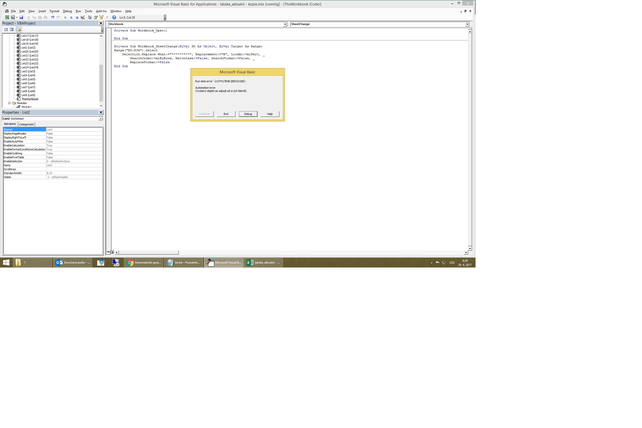 Mám dva soubory excelu (excel1 a excel2). Excel1 je připojený k Excel2 ( tento je uložený na síti) a načítá z něj data. Nahrál jsem makro pomocí záznamu makra, které v určitém rozsahu buněk každého listu souboru Excel1 nahradí veškeré znaky zástupným znakem "X". Teď potřebuju vyřešit moment, kdy se na základě změny v jakékoliv buňce sešitu Excel1 (po aktualizaci a načtení vzdálených dat) toto makro má spustit.