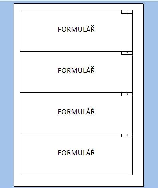 OK, v příloze je malý příklad. Bohužel mi nejde přiložit xls.soubor, tak to přikládám jako obrázek. Číslování formulářů je pouze jako číslo v buňce, ale to není podmínkou, lze to upravit tak, jak bude potřeba. Jde o to, že těchto formulářů se bude tisknout více uživateli poměrně velké množství, proto bych byl rád, aby se čísla měnila automaticky. Na příkladu je uvedeno číslování 1,2,3,4 a já by potřeboval takovou úpravu že, když to teď vytisknu, tak se mi změní číslování na 5,6,7,8.