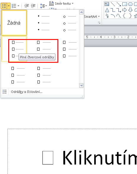 Ahoj, mám problém v powerpointu - Office 2010. Když chci vkládat text s odrážkami, vůbec nemám na výběr z možností - plný čtverec, prázdný čtverec a pod. I v dokumentech, které již byly vytvořeny se odrážky ztrácí pouze do velmi slabého orámování. Zajímavé je, že když tentýž dokument otevřu jinde, je vše v pořádku. Vypadá to, jako by mi chyběla nějaká knihovna.