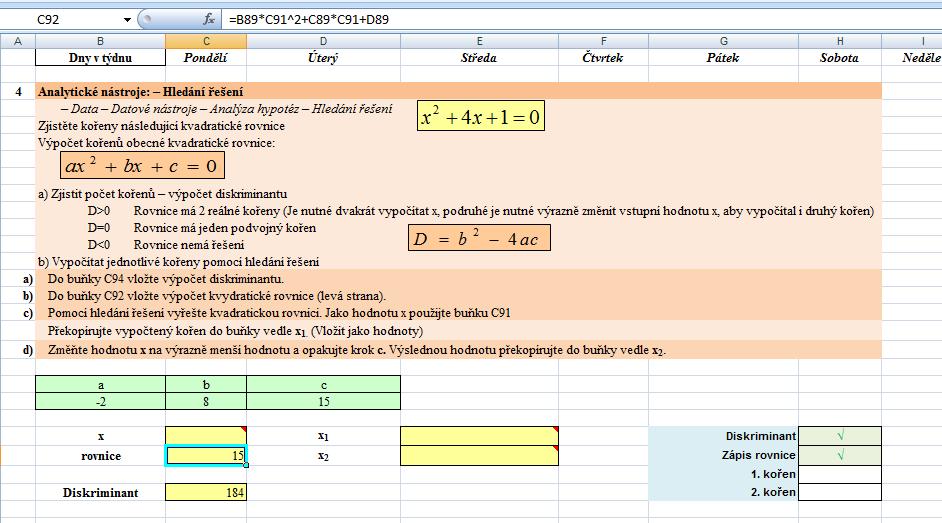 Excel - kvadratická rovnice pomocí Hledání řešení Vyřešeno