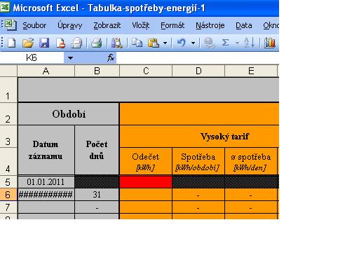 stáhl jsem si tabulku na spotřebu energií, ale nějak mi nefunguje, anebo spíš něco dělám špatně. Pokud zadám první datum odečtu, pak se mi zobrazí, ale další se mi zobrazuje jako přeškrtnutej křížek. Kde je chyba? Heslo je 3220.