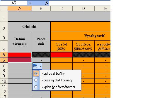 Ještě jsem si všimnul, že první buňka A5 má ten formát co ty potřebuješ, tak ji zkus označit a v pravém spodním rohu buňky se ti zobrazí plus když tam najedeš myší, pak klepni levým tl. a drž a tahni po sloupci dolů
