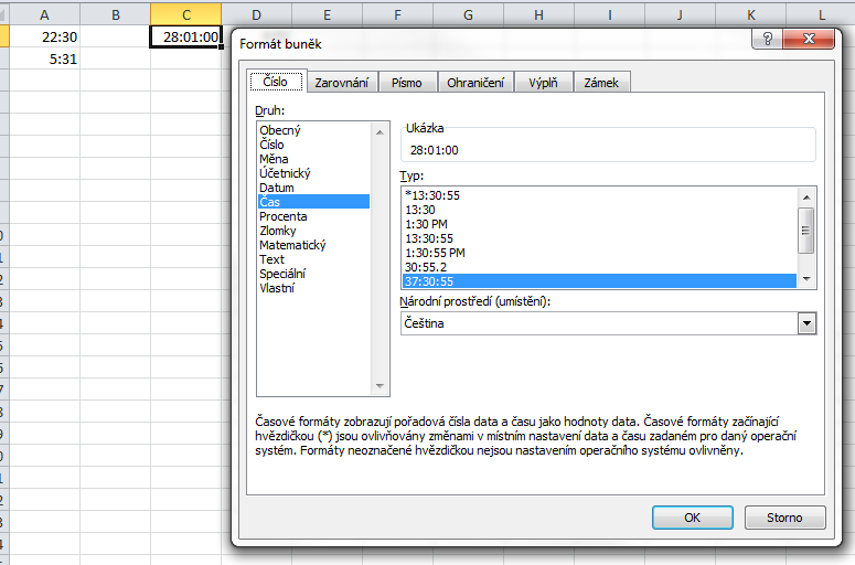 Aby Excel zobrazil výsledek v buňce ve formátu součet hodin:minut,