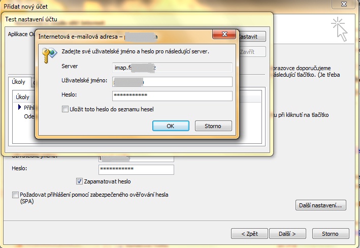 mam problem s vytvořením IMAP účtu v Outlooku 2010. Účet vytvářim ručně, všechny kolonky vyplnim, v Dalším nastavení... nastavim šifrované zabezpečení pro IMAP i pro SMTP. Pak dam OK a Další. Spustí se test nastavení účtu a zkouší se přihlášení na IMAP. Jenže pak vyskočí okno na obrázku a můžu dávat do nekonečna OK a stejně se to nepřihlásí. Když dam Storno, tak to samý probíhá u odesílání zkušební zprávy přes SMTP.