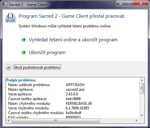 na začátek musím říct že s původním patchem (už nevím jaká verze) jsem neměl žádný problém, ten nastal až po nainstalování patche 2.43.0 Hra po pár minutách spadne s chybou viz. screen, předchází tomu mj. sekání obrazu + zvuku. Zkoušel jsem nainstalovat DirectX 9.0 Runtime i aktualizovat ovladače zvukové karty ale bez úspěchu. Určitě není chyba v HW, to se dá se 100% jistotou vyloučit, jak sem již psal v úvodu se starším patchem vše OK. Měl někdo podobný problém s touto skvělou RPG ?