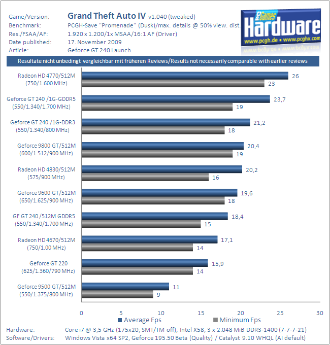 Realita je bohužel trochu jinde. Ze zvědavosti jsem si našel test GTA 4 na GT240 a výsledek je následující (povšimněte si ale, že na i7 3,5GHz):