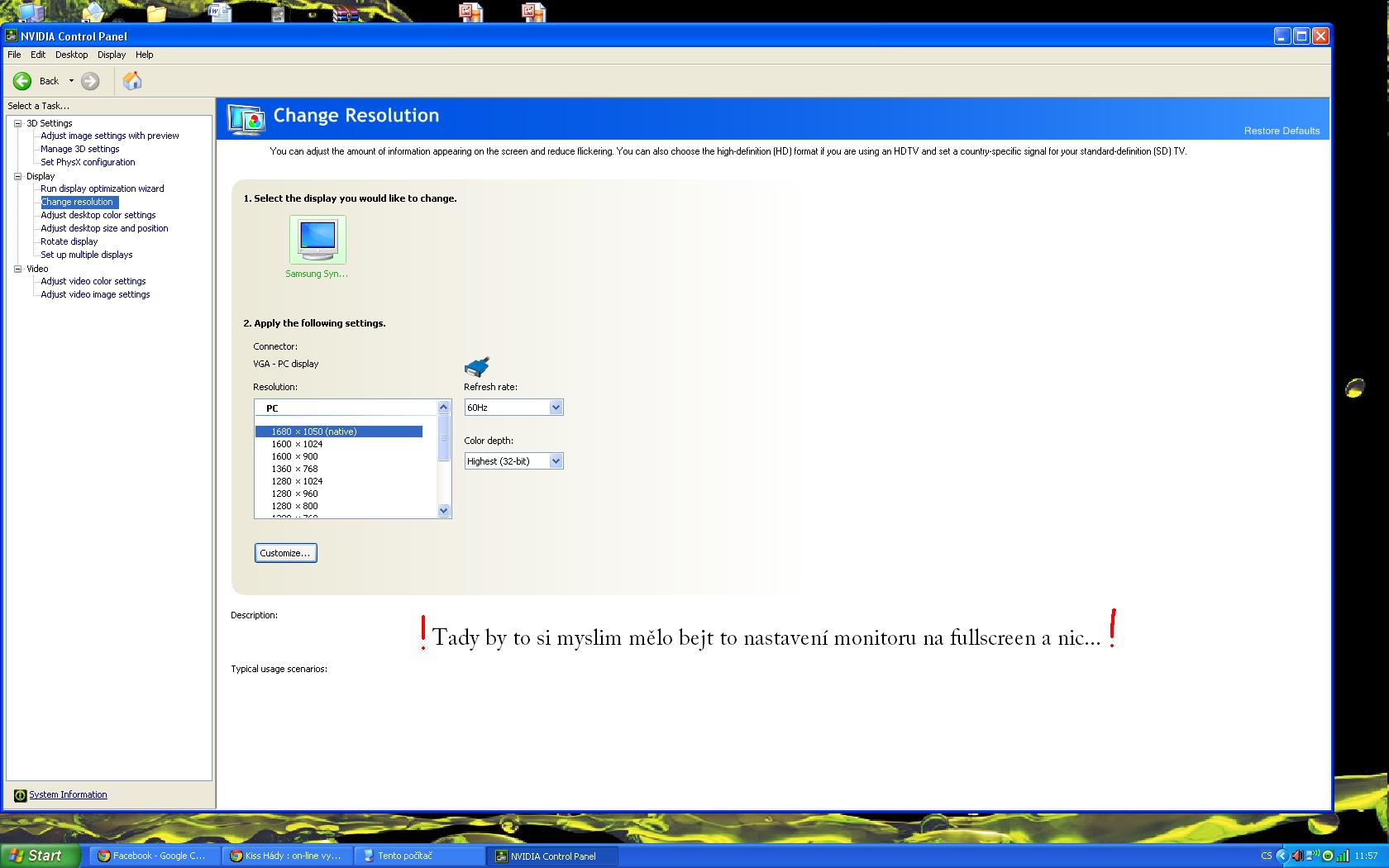 Dobry den,potreboval bych poradit,mám grafickou kartu NVIDIA Geforce 8600 GTS a potreboval bych nastavit na monitoru fullscreen ale nemuzu to nikde v pocitaci to nastaveni najit...ani v nvidia control panel,,jsem uplne bezradny,proto prosim o pomoc :) dekuji