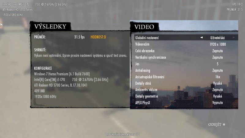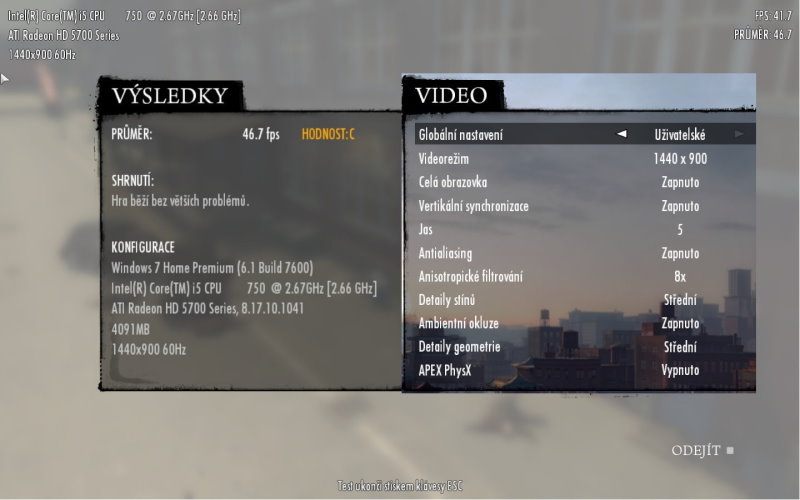 I když mi shrnutí píše že to běží pomalu, a vypisuje takhle malý fps, hra mi běží celkem plynule. Mám všechno na max, 16x AA, PhysX vysoký, stíny atd. na vysoké, kámoš mi to tak nastavil, řikám mu "ty vole, to nemá šanci jet" a ono to jede, fakt koukám že to jde plynule.