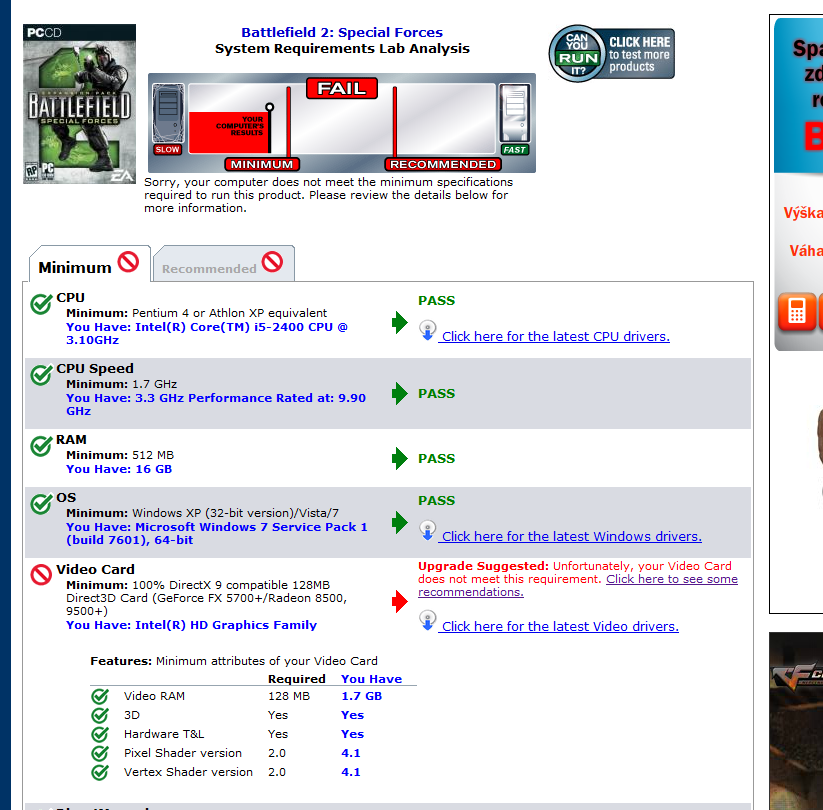 BF3 na integrované nedáš. Minimum je tuším ATI řady 3000 (3870 a výše) a nVidia řady 8 (8800 GT a výše). Ten server ukazuje občas kraviny. Taky mi to psalo, že na integrované nedám Crysis a jelo. Sice vše na low, ale jelo