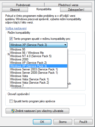 Klikni na aplikaci pravou myší, poté klikni na Vlastnosti, pak na Kompatibilita a zde si nastav