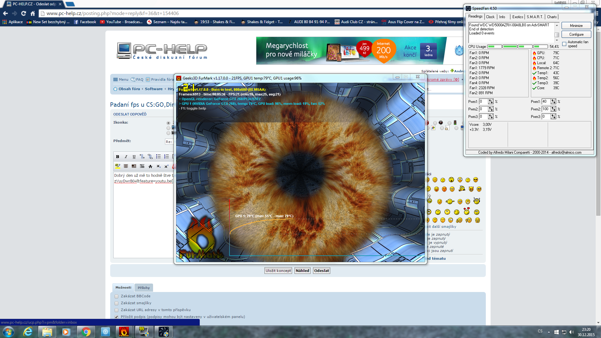 Takže test jsem použil FurMark grafika je uvedena v popise , 83° při 60% otáčkách ventilátoru. Zátěž byla těch 15 minut.