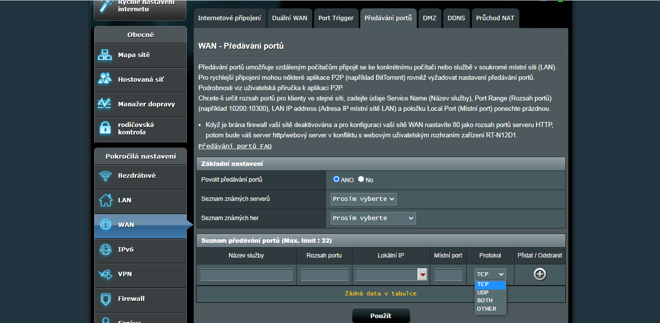 Když se připojím do routeru (168. 192.1.1) - následně v menu dám předávání portů - viz přiložený soubor, tak je možnost zde nastavit připojení, jenže nevím co kam napsat, aby to fungovalo. Má někdo nějaký tip? Pochopil jsem, že protokol má být UDP, název služby asi libovolný, ale nevím co dál. (zkoušel jsem rozsah portu 16000 a nic)