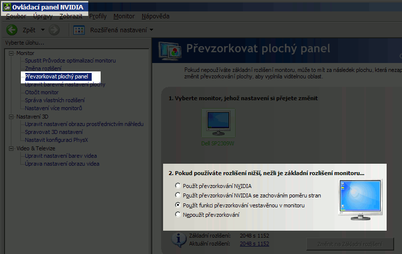 - Buď to najdeš v přímo v nastavení monitoru (OSD) – já to tam mám v menu pod Display Settings / Wide Mode s následujícími hodnotami: