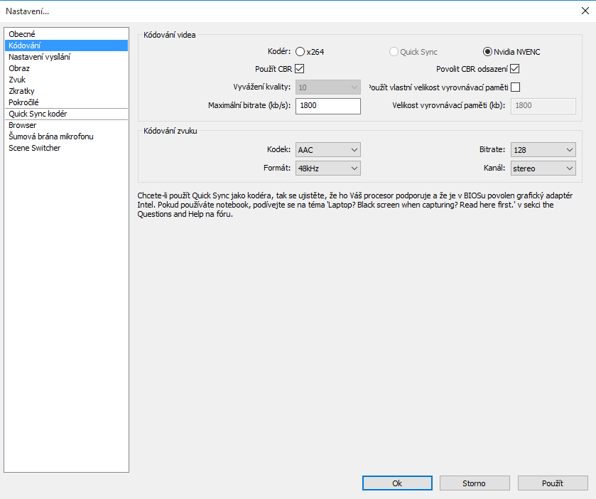 Já vím, že 1800 bitrate je málo, ale když jsem streamoval přes x264 a měl bitrate na 2500, lidem s pomalým netem to "lagovala". Jelikož nemám partnership od twitche a lidi si nemůžou nastavit kvalitu podle jejich připojení, tak jsem to snížil na 1800.